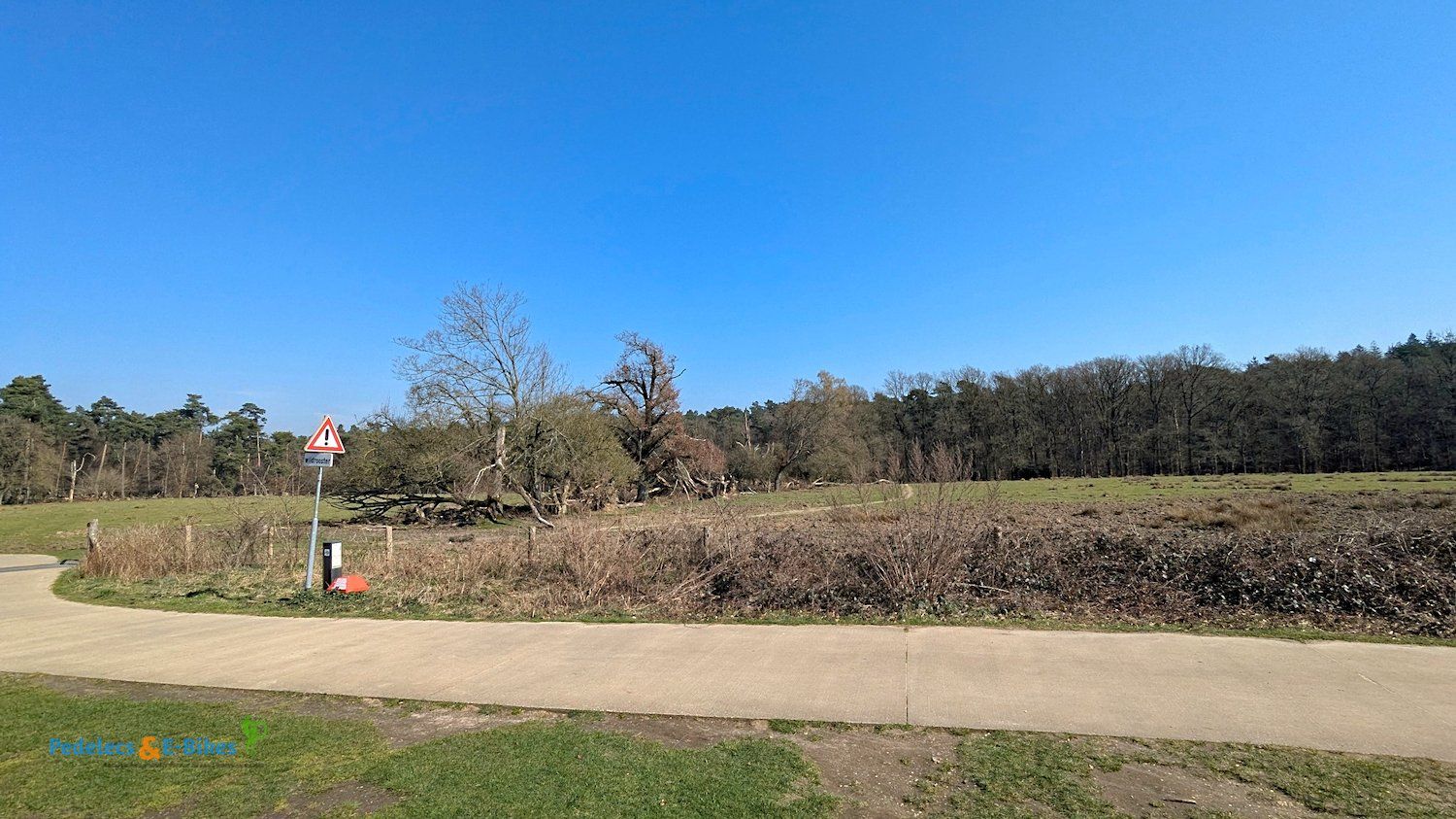 Dieser Kreuzungspunkt von Wander- und Fahrradwegen soll einer der schönsten Orte der Veluwe sein und eignet sich perfekt für einen wohlverdienten Zwischenstopp auf der Terrasse, wo auch wir jetzt unsere Pedelecs parkten, um uns zur Mittagszeit dann bei schönster Sonne zu stärken.