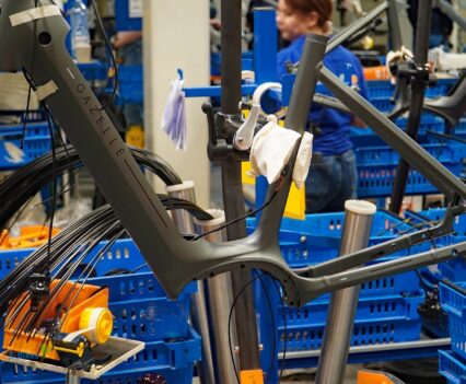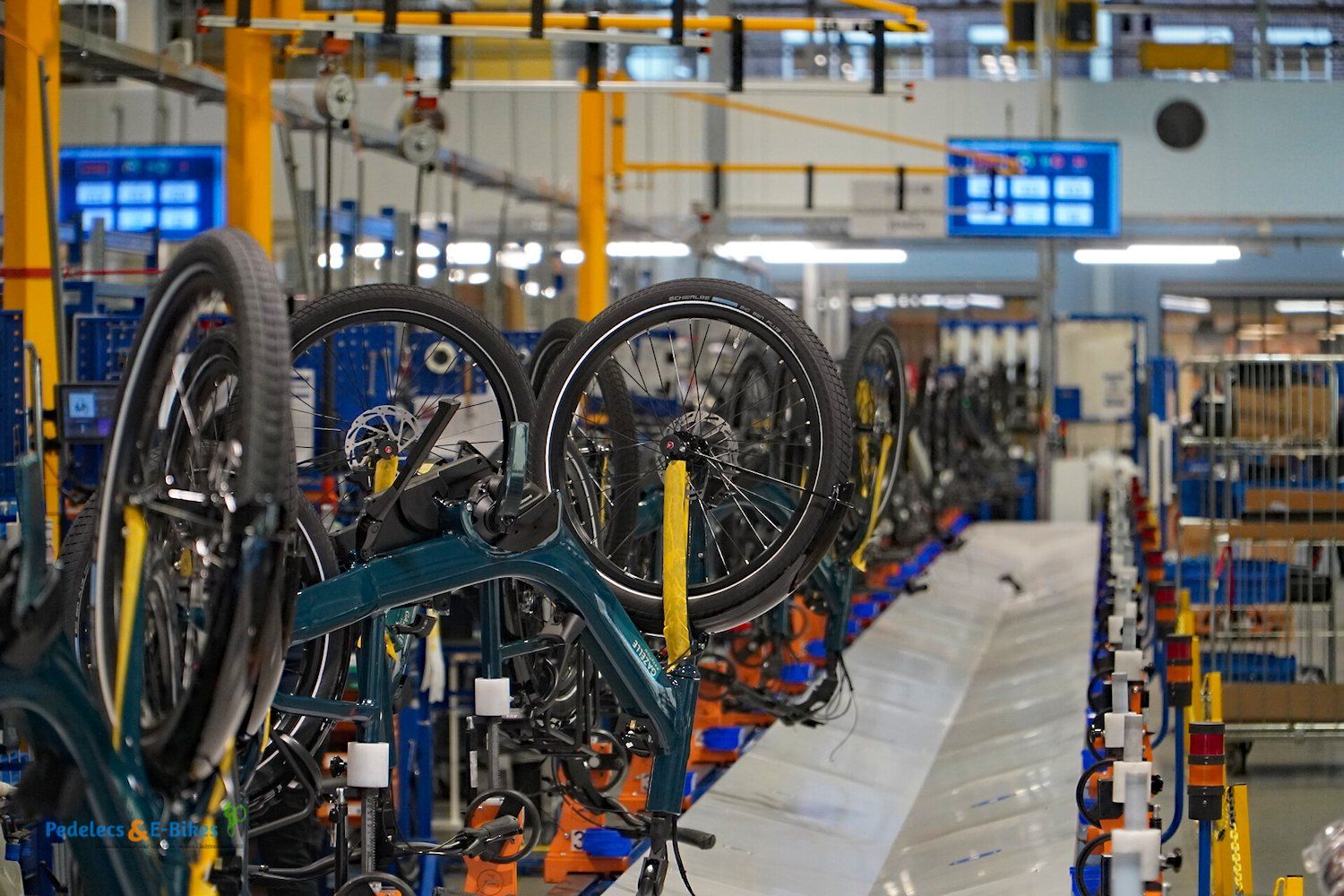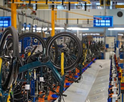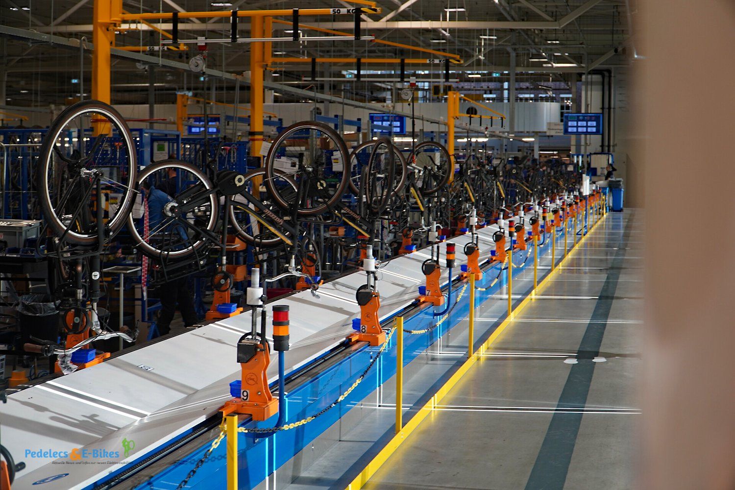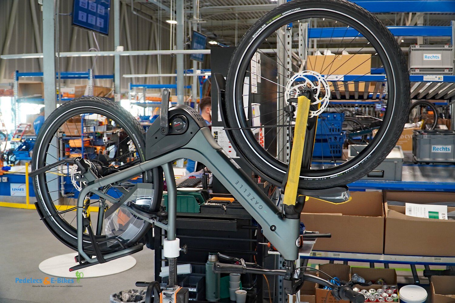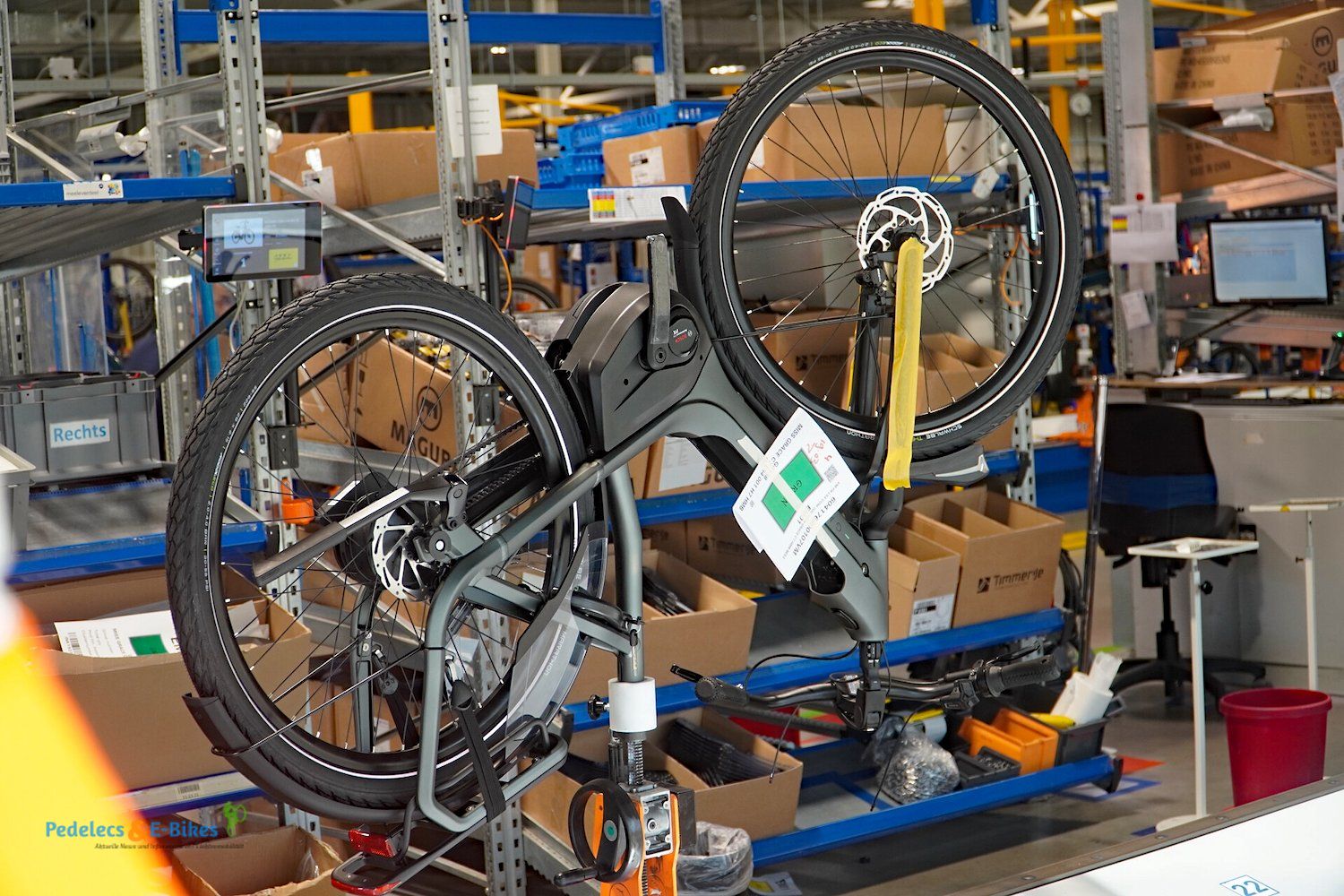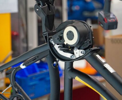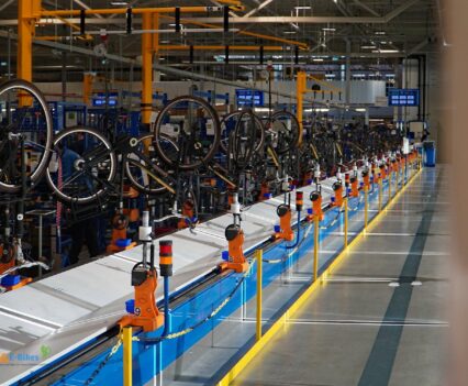Über die Laufradmontage, bei welcher auch diverse Nabenschaltungen eingespeicht wurden und viel auf vollautomatische Zentriermaschinen zurückgegriffen wurde, gelangten wir dann an die Produktionslinien, wo die entsprechenden Räder und Pedelecs dann aus den Rahmen, Komponenten und Vorbaugruppen zusammengesetzt wurden.