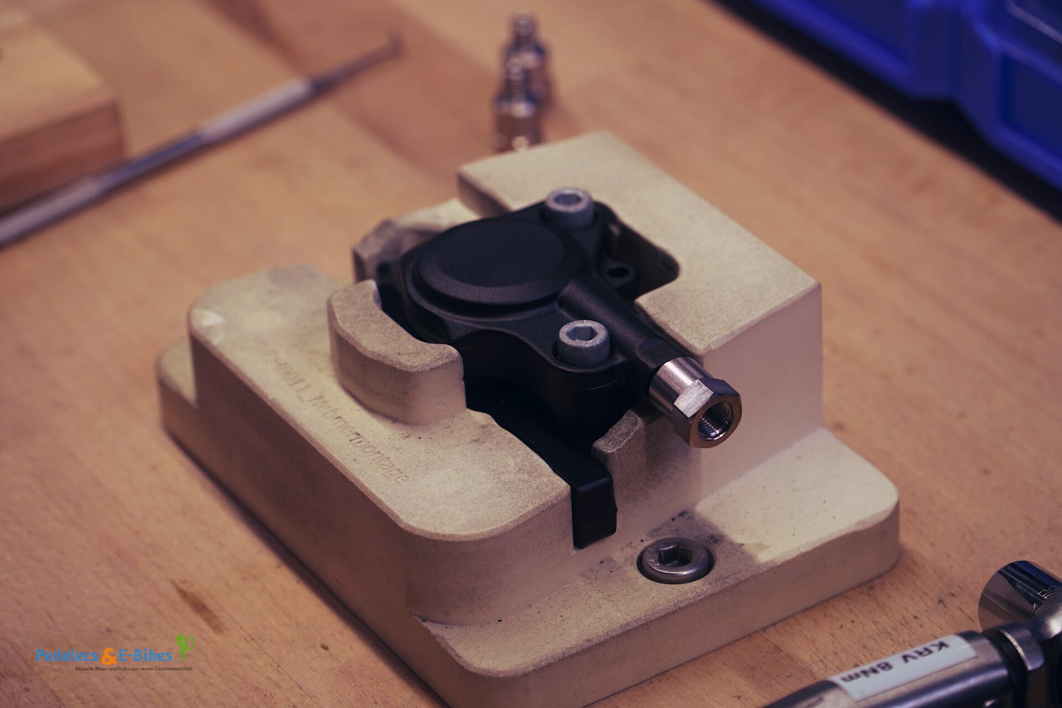 Nun kann man den Bremssattel über den Bremsschlauch mit dem vorbereiteten Bremsgriff verbinden, wobei auch hier ein gewisses Drehmoment beim Anziehen verwendet wird.