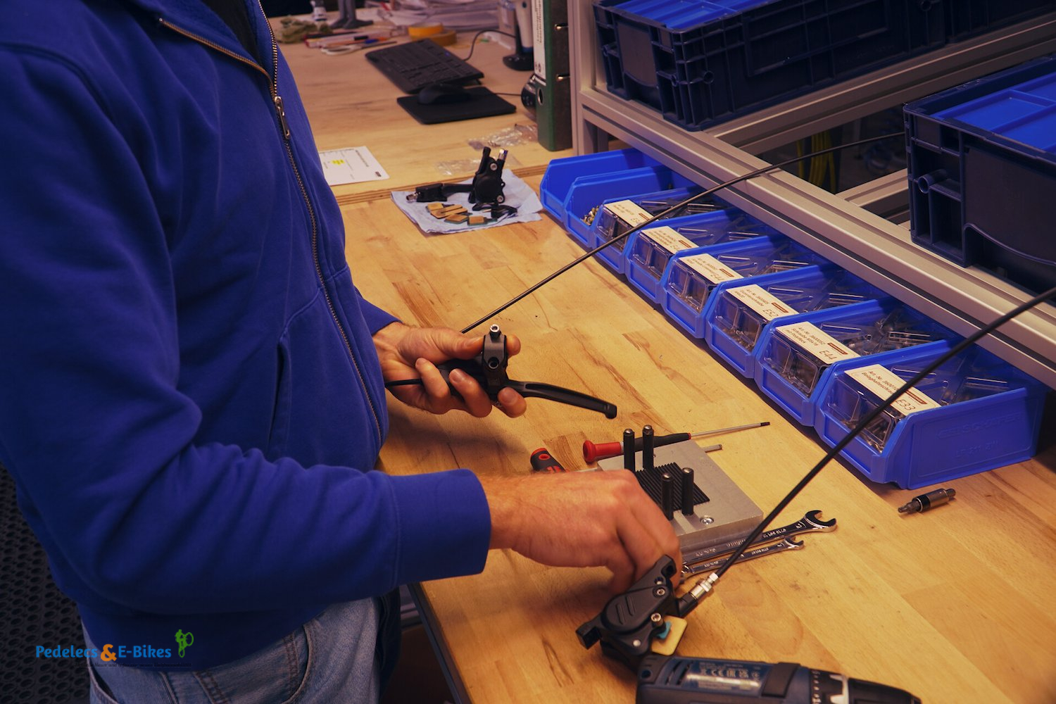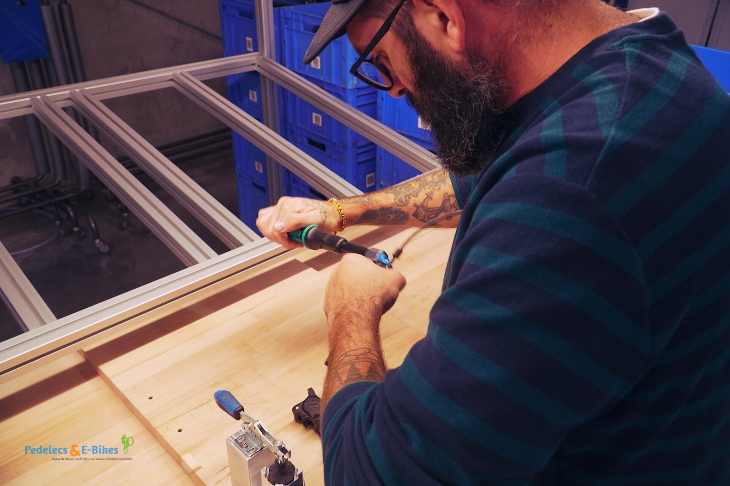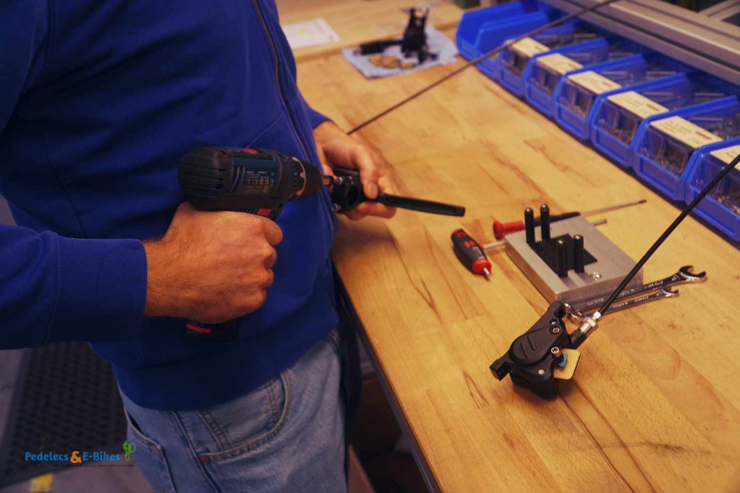 Auch am Bremshebel komplettiert der Mitarbeitet die benötigten Halterungen.