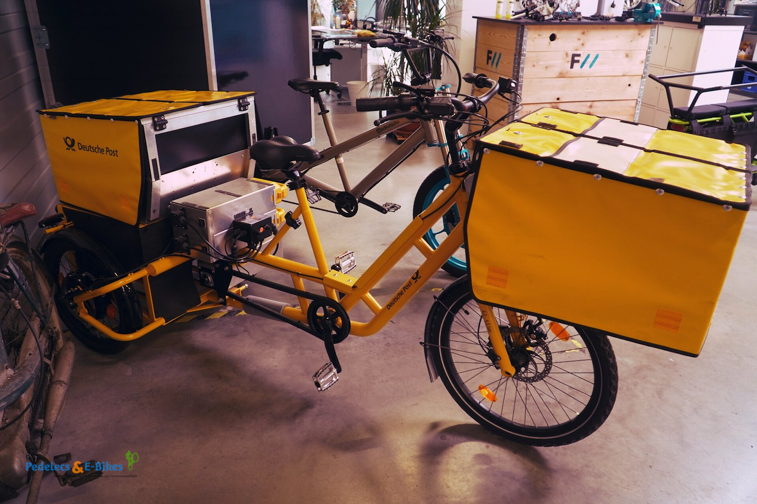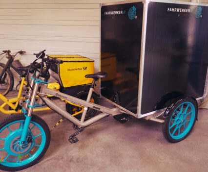Zwischen Büro und Produktion stehen einige Fahrzeuge, die mit Produkten des Unternehmens ausgerüstet sind, darunter die allseits bekannten Scooter-Trikes der Deutschen Post.