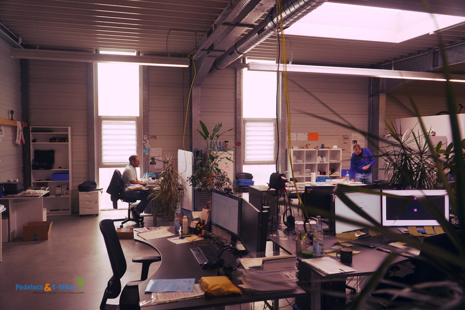 Büro, Werkstatt und Produktion befinden sich offen in einer großen Halle und sind lediglich durch Trennelemente voneinander abgegrenzt. Unmittelbar am Eingangsbereich ist das Büro platziert. Der Chef arbeitet an einem Einzelarbeitsplatz, während die übrigen Büromitarbeiter ihre Aufgaben an einer Dreier-Schreibtischkombination erledigen.