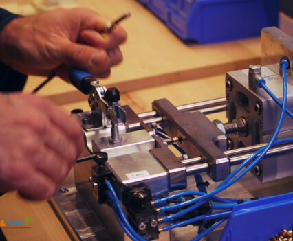 Anschließend besichtigten wir die Produktion, wo Benjamin uns den Fertigungsprozess einer Bremsanlage demonstrierte. Fahrwerker bietet derzeit Bremsen für zwei- (F-2000) und vierrädrige Fahrzeuge (F-4000) an, zukünftig ergänzt durch die F-Vision für den sportlichen Einsatz.