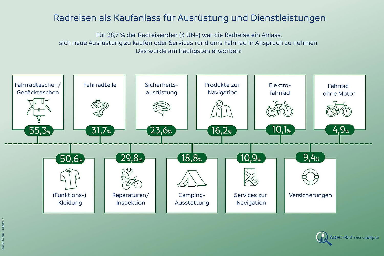 Erstmals erhob der ADFC auch Investitionen rund um Radreisen. Mehr als ein Viertel der Reisenden mit drei oder mehr Übernachtungen kaufte neue Ausrüstung oder nutzte Serviceleistungen. Besonders gefragt waren Fahrrad- und Gepäcktaschen (55,3 Prozent), Funktionskleidung (50,6 Prozent) und Fahrradteile (31,7 Prozent). Knapp 30 Prozent investierten in Reparatur oder Inspektion.