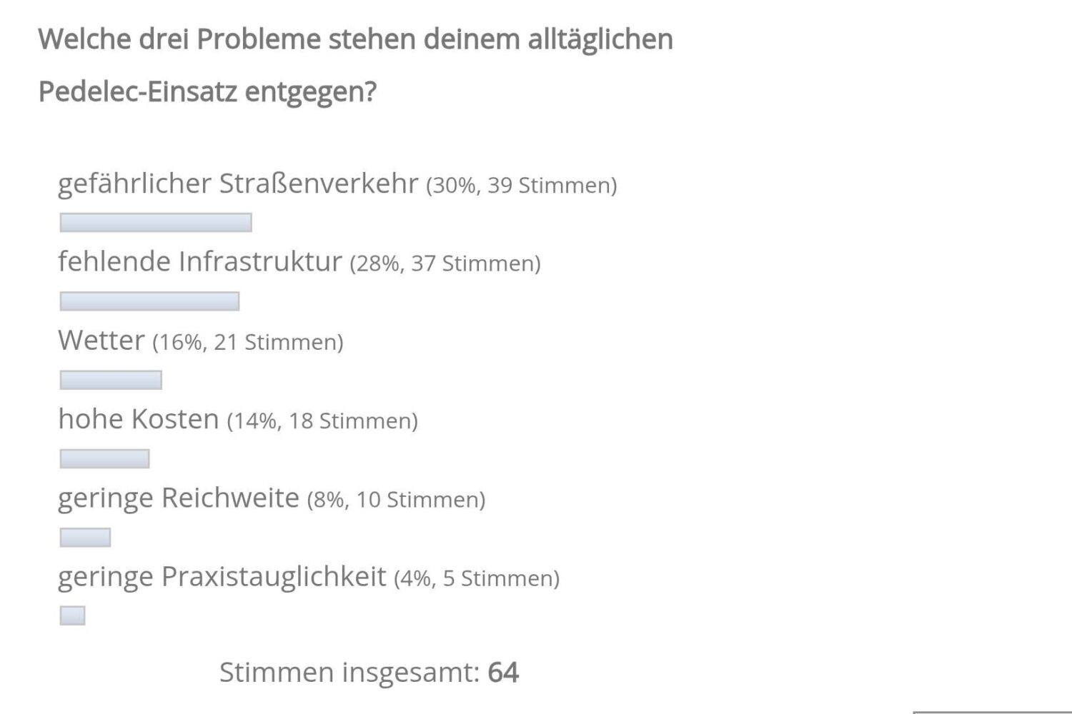 Wer regelmäßig mit dem Pedelec unterwegs ist, kennt die Herausforderungen, die über den reinen Fahrspaß hinausgehen. In einer aktuellen Umfrage auf der Webseite haben 64 Teilnehmende die Frage beantwortet: „Welche drei Probleme stehen deinem alltäglichen Pedelec-Einsatz entgegen?“