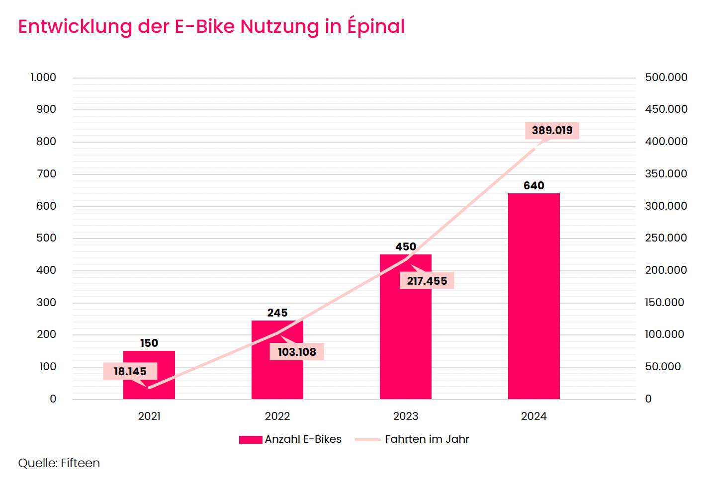 In Frankreich, wo Systeme wie Vilvolt im Gemeindeverband Épinal bereits seit 2021 erfolgreich laufen, zeigen die Zahlen Wirkung: Die Nutzung stieg von 1,47 auf 2,6 Fahrten pro Rad und Tag, bei gleichzeitig wachsender Flotte. 66 % der Nutzer gewinnen durch das Angebot an Autonomie, 52 % reduzieren ihre Pkw-Nutzung.