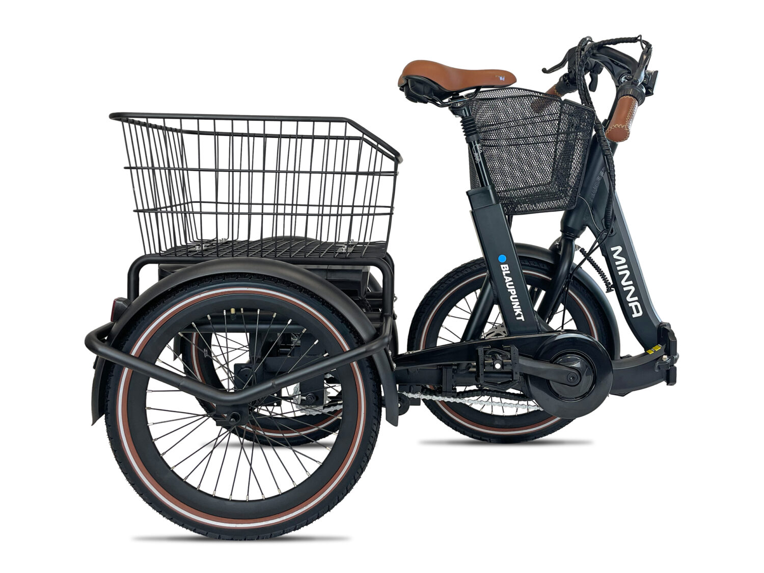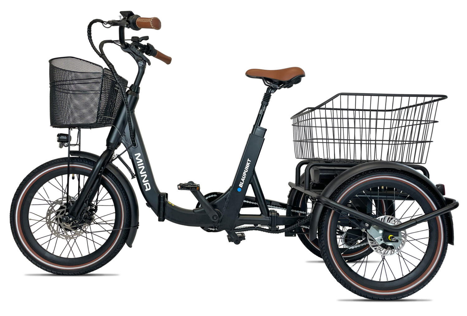 Blaupunkt bringt das faltbare E-Lastenrad MINNA in überarbeiteter Form auf den Markt. Das 20-Zoll-E-Trike richtet sich als kompakter Tiefeinsteiger an Nutzerinnen und Nutzer, die eine platzsparende Transportlösung für Alltag und Einkauf suchen. Die Neuauflage setzt auf einen leichteren, zugleich steiferen Rahmen, einen verfeinerten Faltmechanismus sowie zusätzliche sicherheitsrelevante Ausstattungsdetails. Wie bisher ist das Modell StVZO-konform ausgerüstet und wird inklusive Beleuchtung, Reflektoren, Schutzblechen und zweier Transportkörbe ausgeliefert.