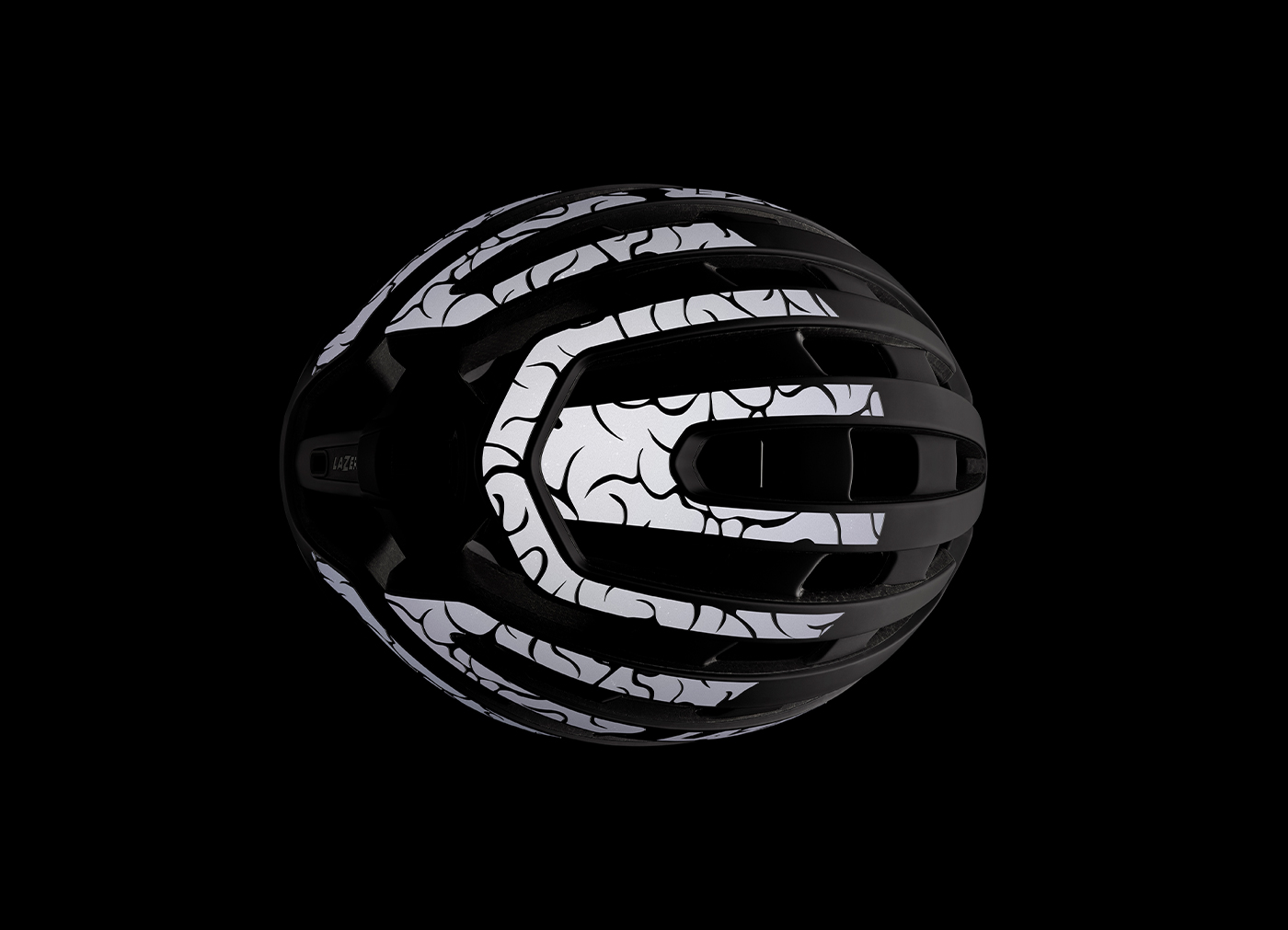 Das Design basiert auf dem mattschwarzen Farbton des Standardmodells. Ergänzt wird er durch ein beinahe unsichtbares Muster, das erst im Lichtkegel von Autos oder Fahrrädern aufleuchtet: eine reflektierende Gehirnstruktur, die den Slogan visuell übersetzt.