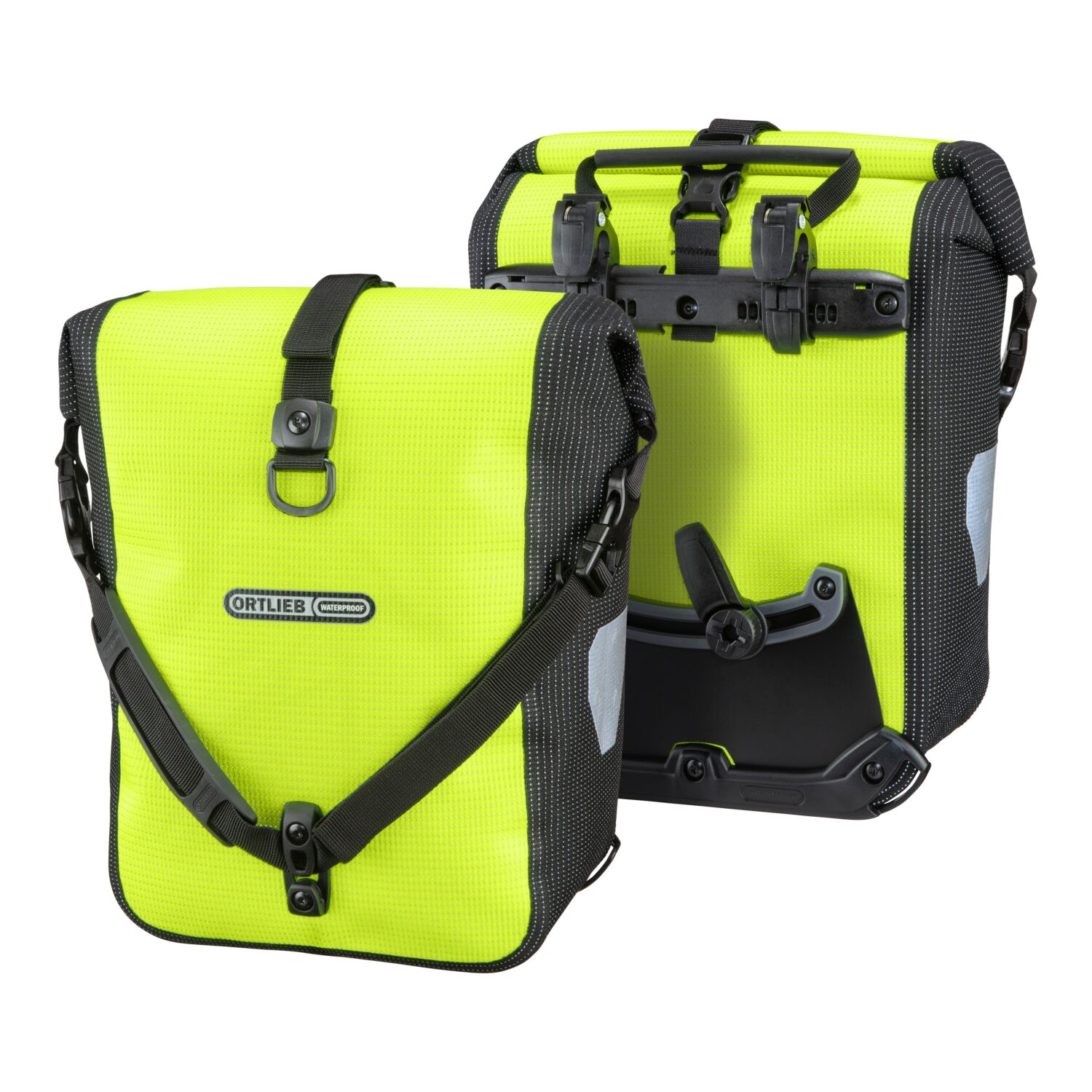 Bei der Fahrradtasche „Sport-Roller High-Vis“ von Ortlieb ist ein Reflexgarn verarbeitet, das im Scheinwerferlicht die komplette Tasche reflektieren lässt. Die Tasche bietet mit 14,5 Litern Volumen etwa Stauraum für Arbeits- oder Schulmaterialien, die sich dank wasserdichtem Material auch bei Regen sicher transportieren lassen. Zudem sind an den Seiten nochmals reflektierende Elemente eingearbeitet, damit eine Rundum-Sichtbarkeit gewährleistet ist. Die Tasche gibt es wahlweise in Schwarz oder Gelb.