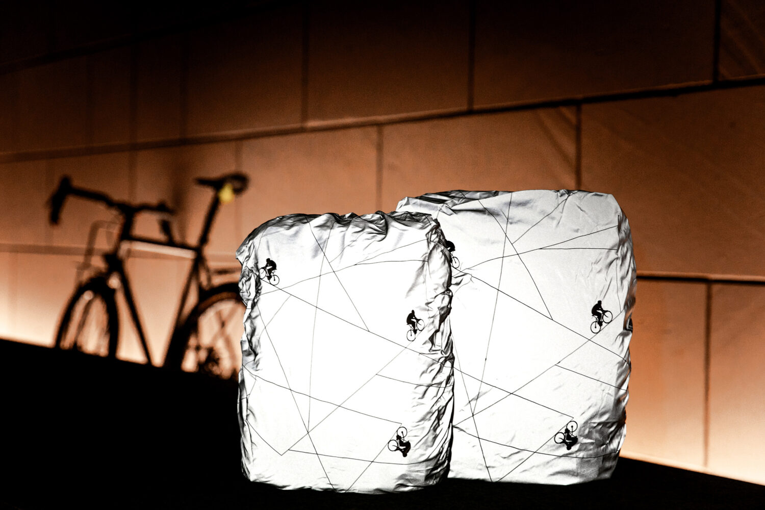 Wer keine reflektierende Tasche besitzt, kann sich mit einem wasserfesten, reflektierenden Taschenüberzug, wie dem „Lux“ von Fahrer Berlin behelfen. Den Überzug gibt es in zwei Größen, sodass er universell auf unterschiedliche Taschengrößen passt. Wenn er nicht benötigt wird, kann man ihn in einem Netzbeutel mitnehmen.
