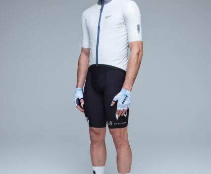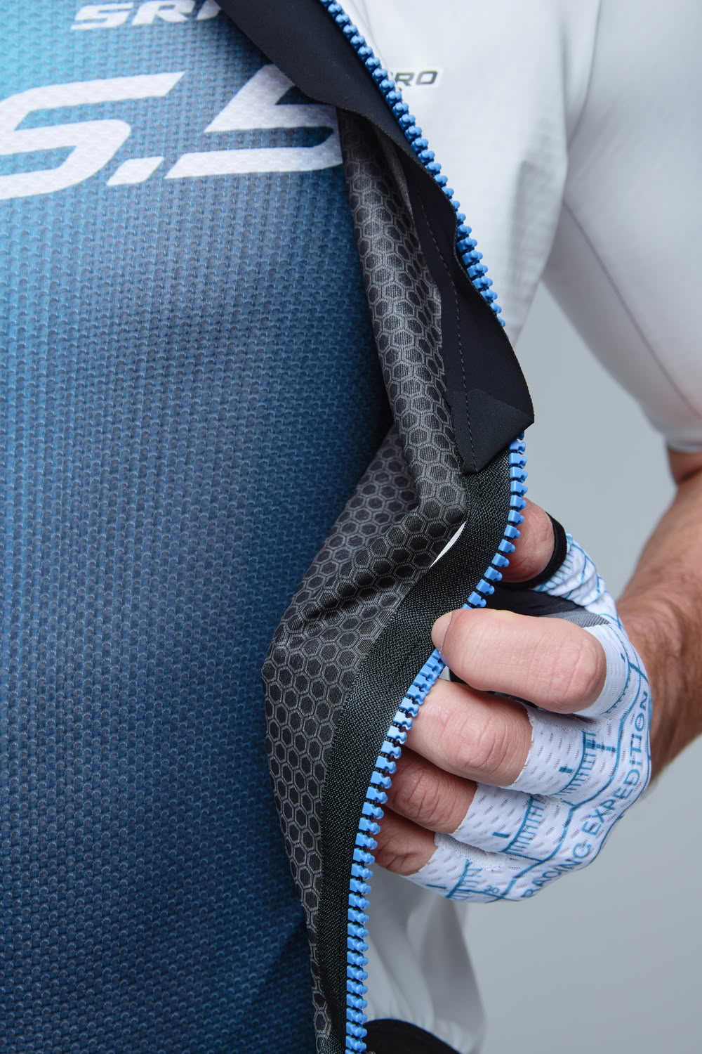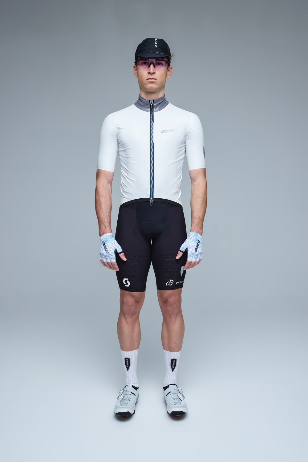 Das Rain Shell Aero Jersey bildet die technische Grundlage des Systems. Das Kurzarmtrikot besteht aus einem dreilagigen, proprietären Material mit Doppelmembran und schnell trocknender Innenseite. Es ist leicht, atmungsaktiv und gleichzeitig vollständig wasserdicht.