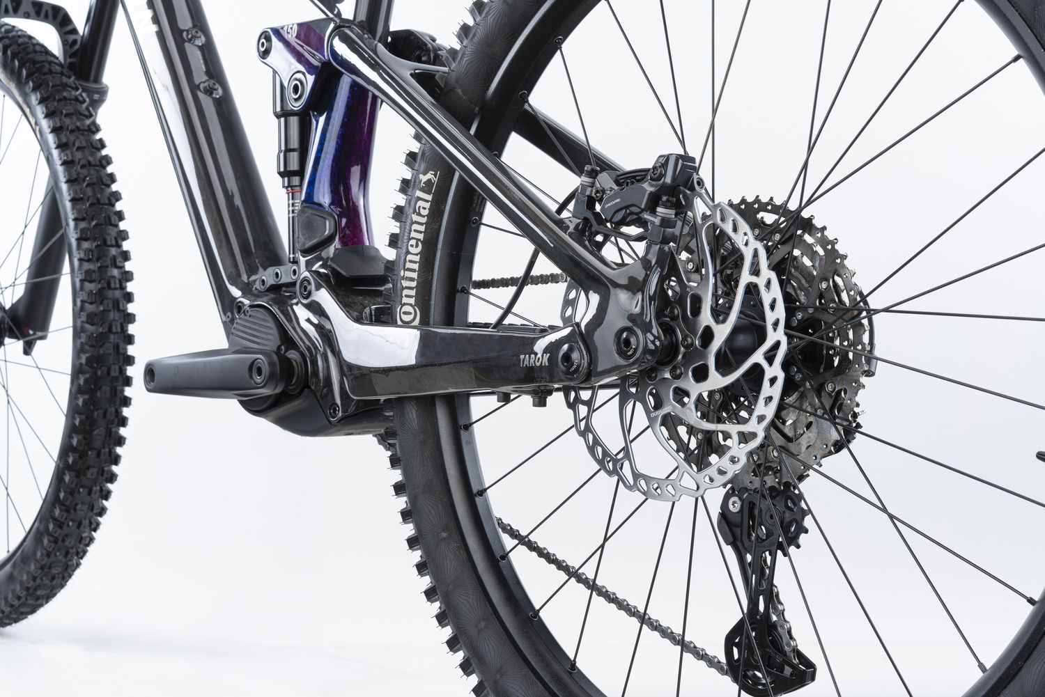 Der Rahmen des Tarok basiert auf einer als HSC-Carbon bezeichneten Konstruktion und wiegt laut Hersteller rund 2,4 Kilogramm. Das ist ein konkurrenzfähiger Wert im Full-Power-Segment, wo Rahmengewichte häufig durch die Integration großer Akkueinheiten steigen.