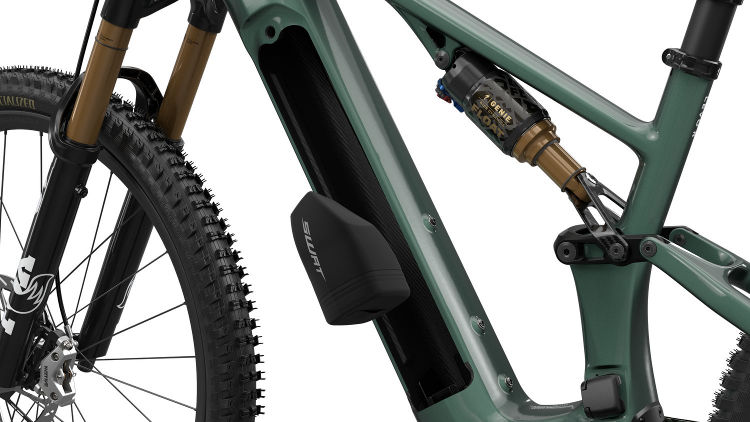 Der Rahmen des Turbo Levo R besteht aus FACT 11M Carbon inkl. Hinterbau. Das Levo R wiegt in der leichtesten S-Works-Variante 21,13 Kilogramm – ein solider Wert, aber keinesfalls eine Benchmark. Die Integration des Wattage-Cottage-Akkuschachts und der SWAT-Aufbewahrung im Unterrohr übernimmt Specialized vom Levo 4, was zeigt, dass die Plattform weitgehend identisch bleibt.