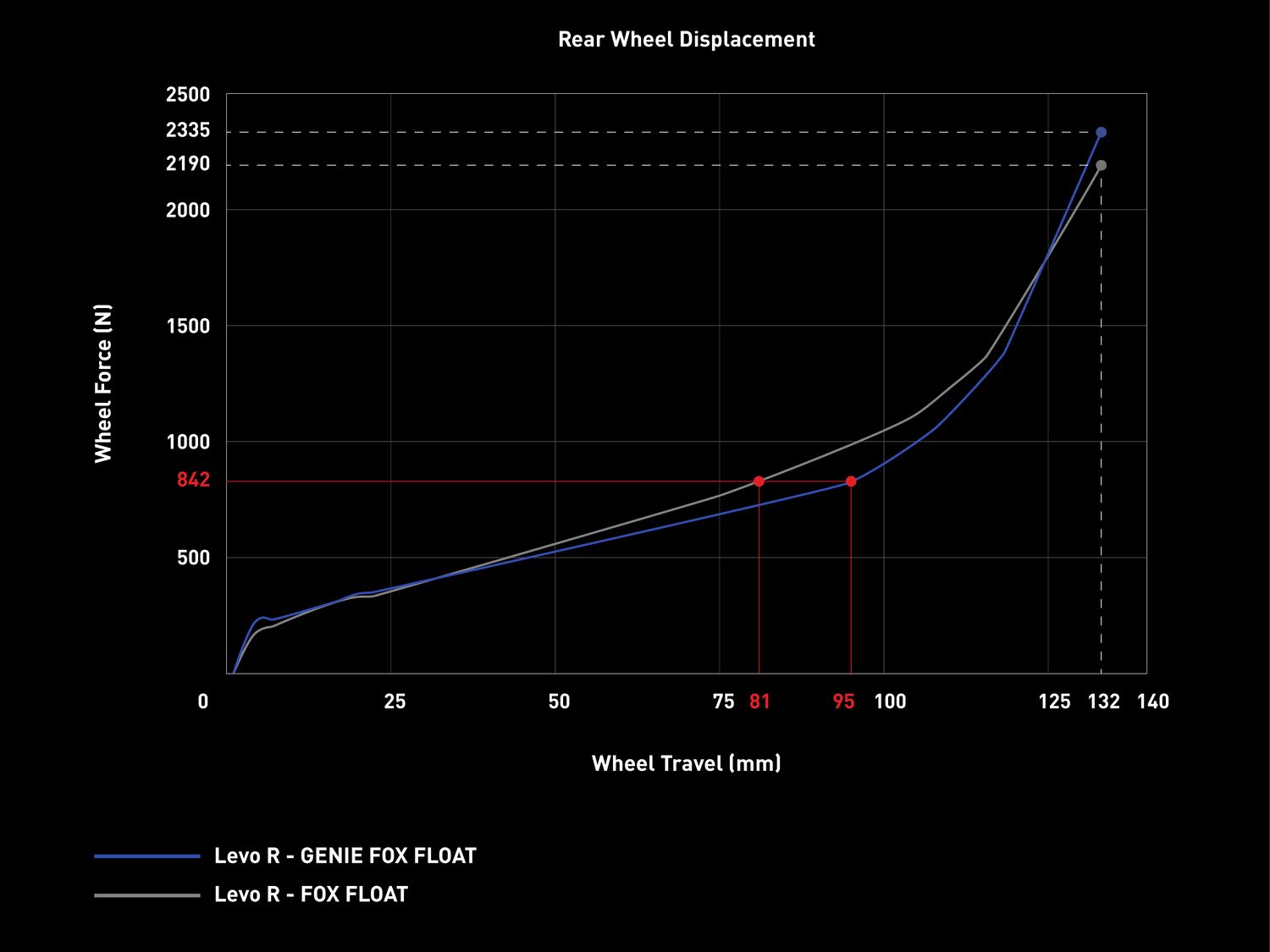 Die praktischen Auswirkungen dieser Kennlinie zeigen sich im Fahrverhalten. Bei einer Kraft von 842 Newton am Hinterrad nutzt das GENIE-System 95 Millimeter Federweg, während ein konventioneller FOX FLOAT Dämpfer unter gleicher Belastung nur 81 Millimeter erreichen würde. Das entspricht einem Unterschied von 17,3 Prozent.