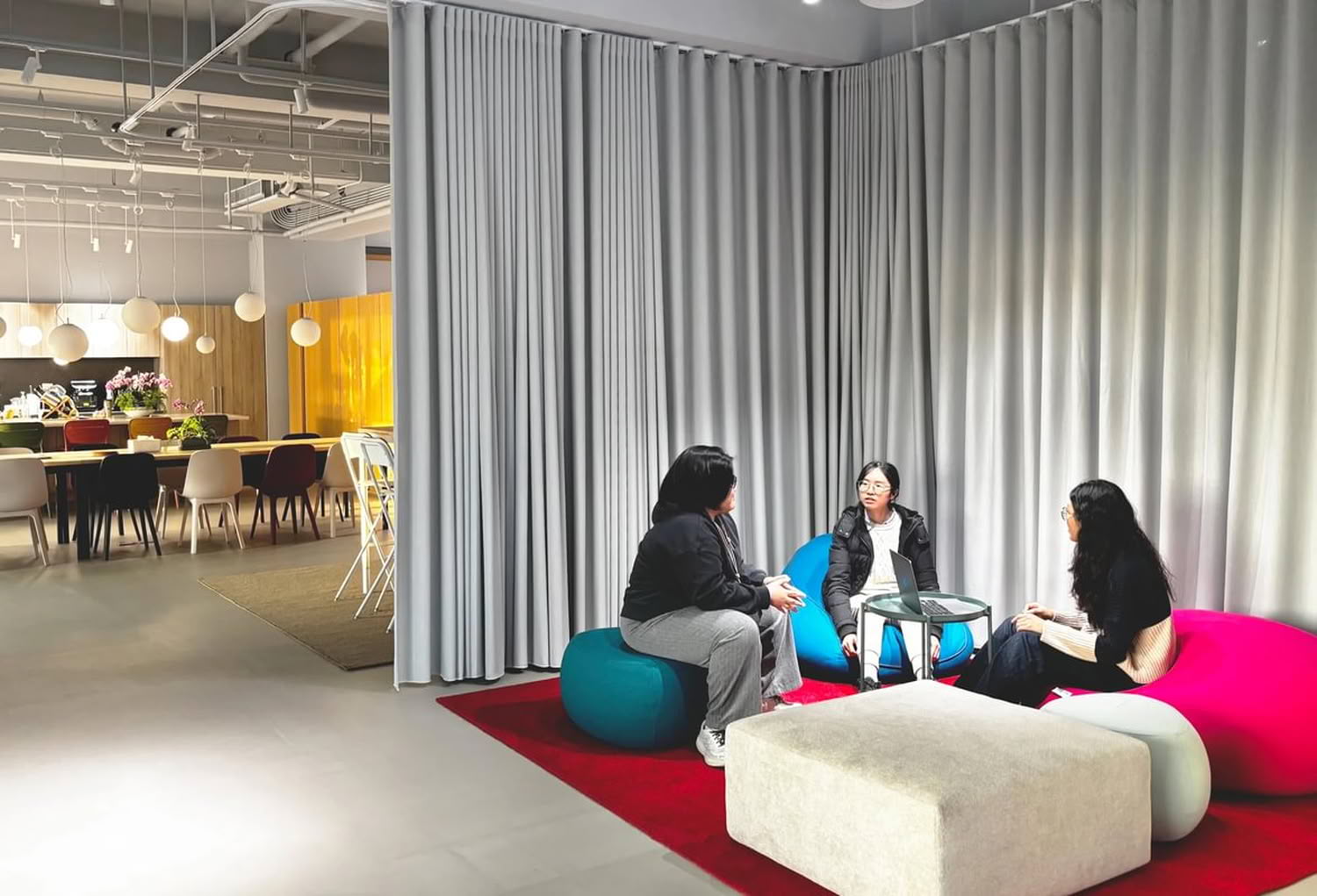 Kern des offenen Bürokonzepts ist ein zentraler „Hub“, der als Treffpunkt für spontane Besprechungen und informellen Austausch dient. Ergänzt wird dieser durch verschiedene Sitzecken sowie sogenannte „Zoom Pods“, die sowohl für lebhafte Diskussionen als auch für vertrauliche Gespräche genutzt werden können.