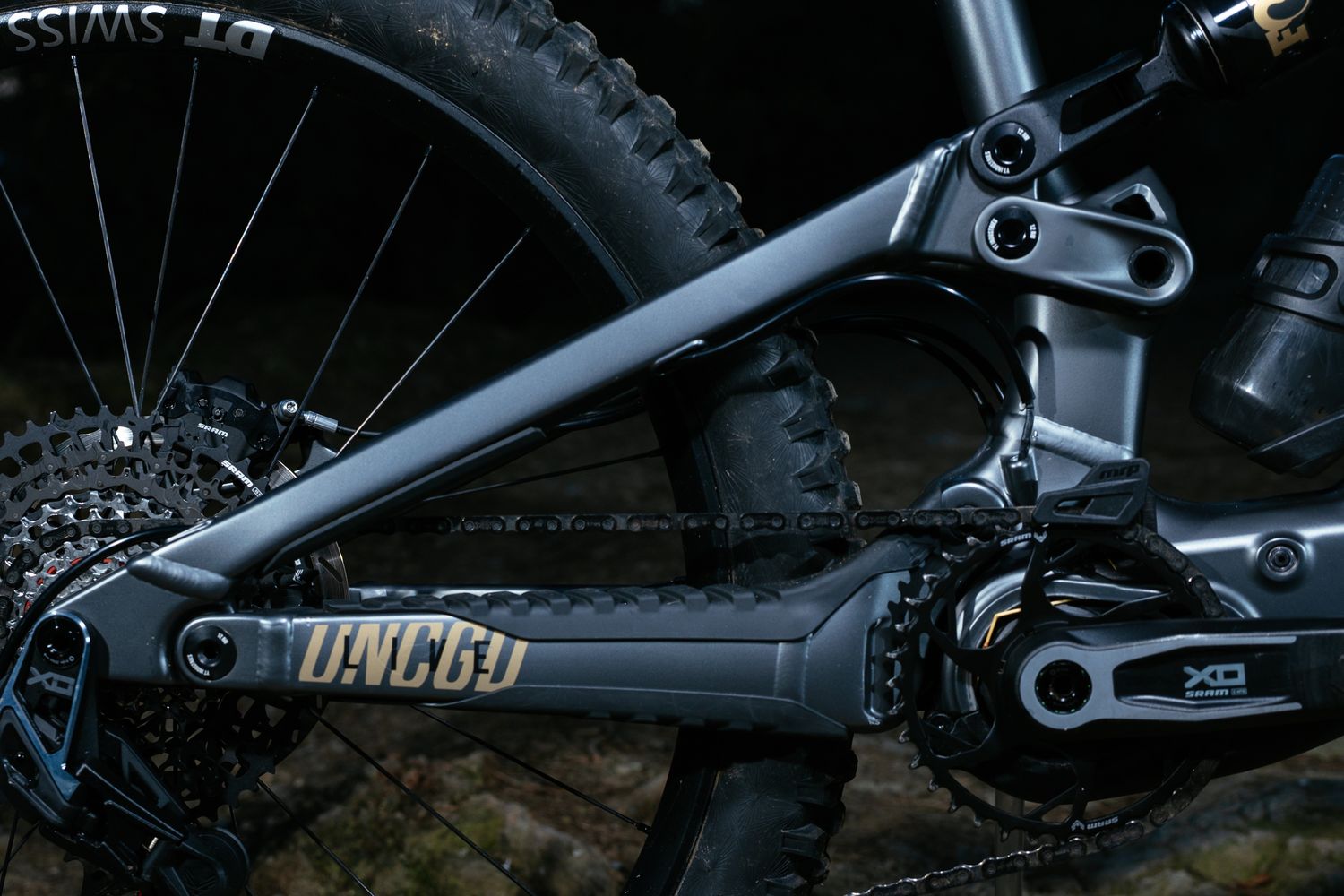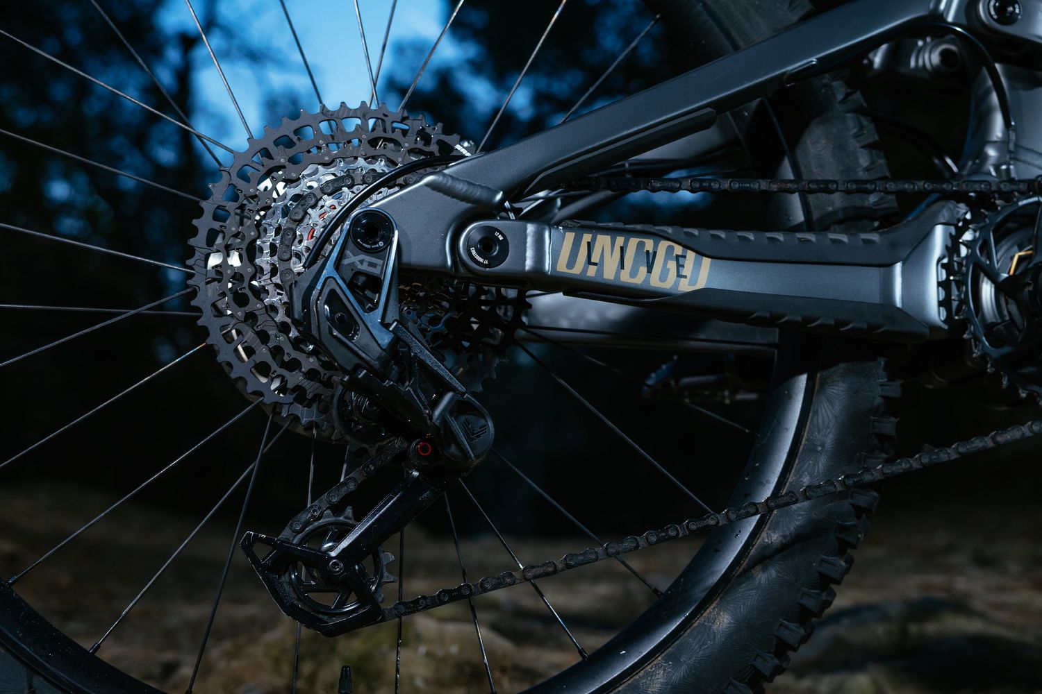Der Antrieb besteht aus einem SRAM X0 Eagle Transmission-Schaltwerk in AXS-Ausführung (kabellos, 12-fach) mit SRAM XX Eagle T-Type-Kettenblatt (36 Zähne) und einer XS-1275-Kassette (10–52 Zähne).