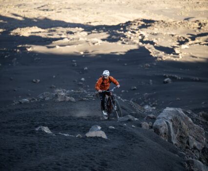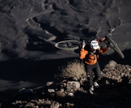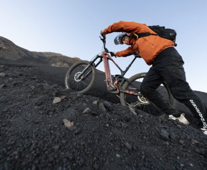 Bis rund 2.100 Meter gelingt es ihm, zumindest streckenweise zu fahren. Doch je näher der Krater rückt, desto häufiger kommt der Walk-Modus zum Einsatz, bis er schließlich das Bike schultern muss. Der Boden färbt sich rot und gelb, mineralisch, fremd – wie auf einem anderen Planeten. Die brennende Sonne zieht ihm die Feuchtigkeit aus den Lippen, die Sonnencreme ist längst verschwunden.