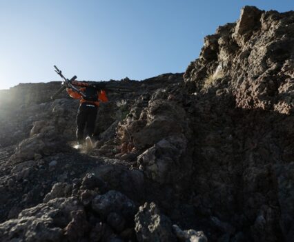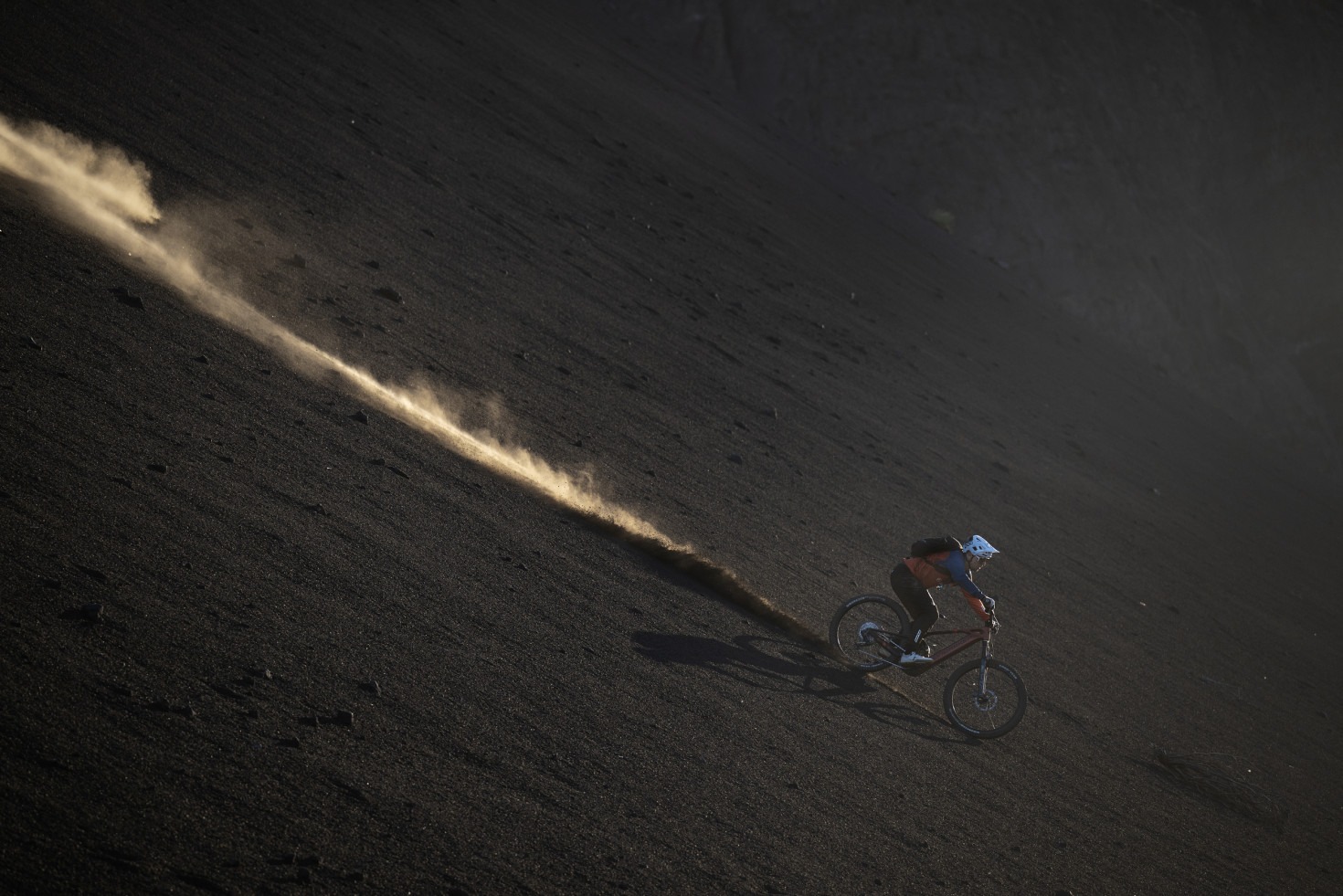 Was auf dem Weg hinauf ein zäher Kampf war, wird nun zum Rausch. Der Vulkan verwandelt sich in eine gewaltige Sandpiste. Gaspi surft durch feinen Staub, zieht Linien, die zuvor niemand gefahren ist, erreicht Geschwindigkeiten von bis zu 80 km/h und beschreibt später: „Die beste Abfahrt meines Lebens.“