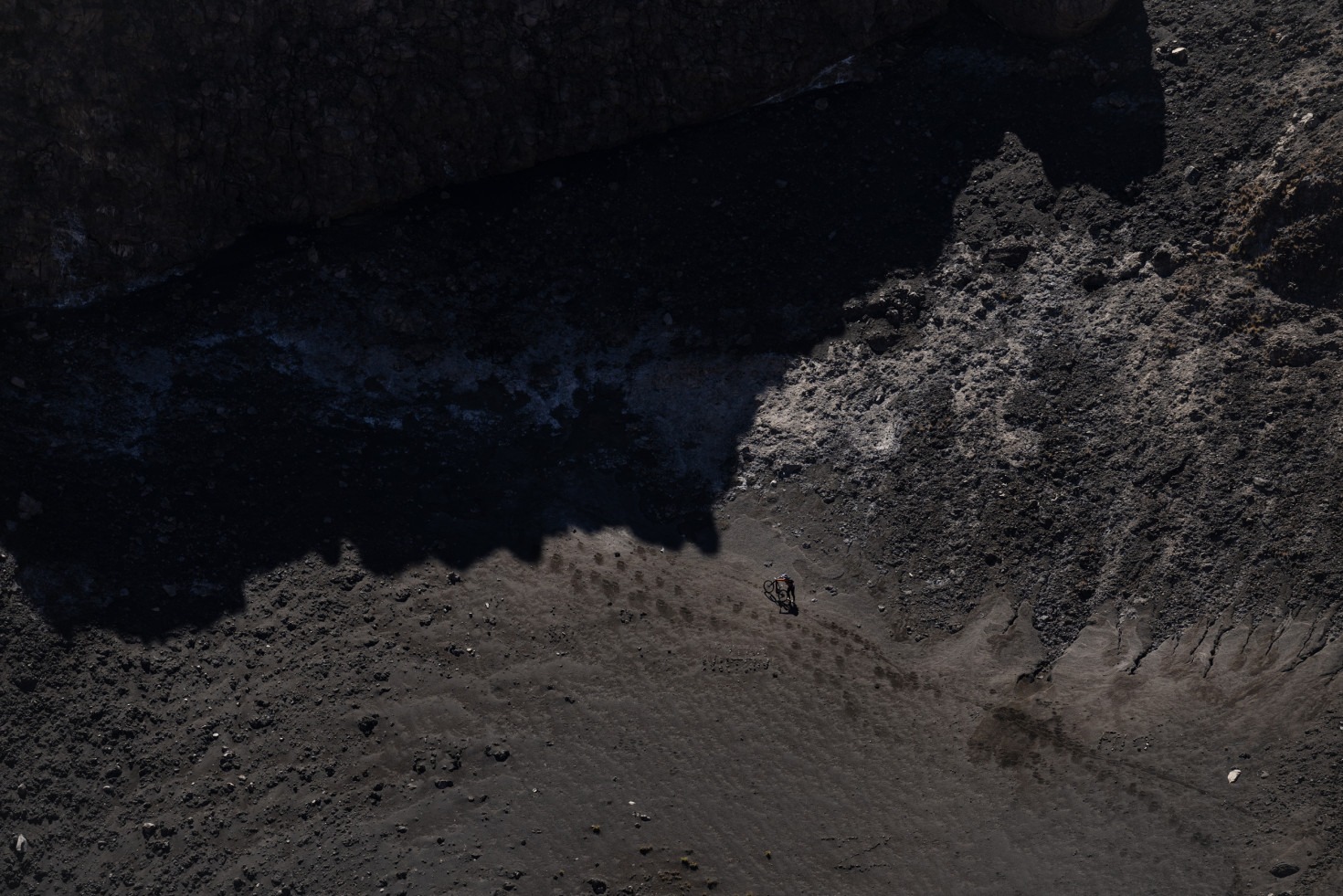 Am Strand startet der Versuch: knapp 3.000 Höhenmeter bis zum höchsten Punkt der Insel. Der Morgen ist kalt, doch nach Sonnenaufgang verwandelt sich die Luft in ein glühendes Band aus Hitze und Wind. Gasperotti kämpft sich zunächst durch Gestrüpp, später über lose Lavaflächen – ein Untergrund, der unter den Reifen knirscht, nachgibt und immer wieder zum Absteigen zwingt.