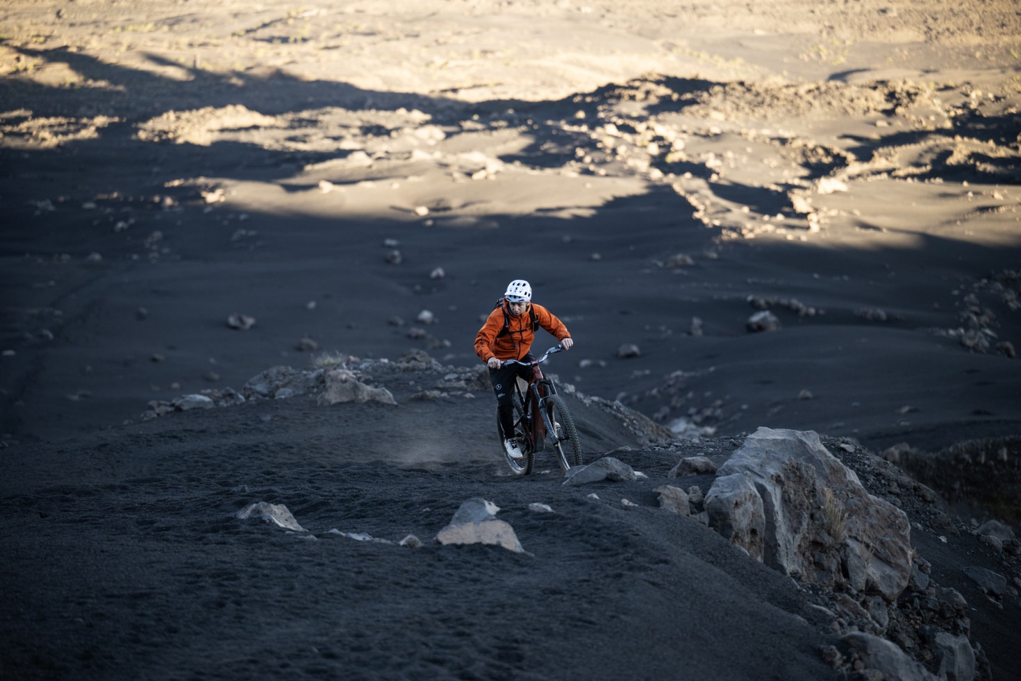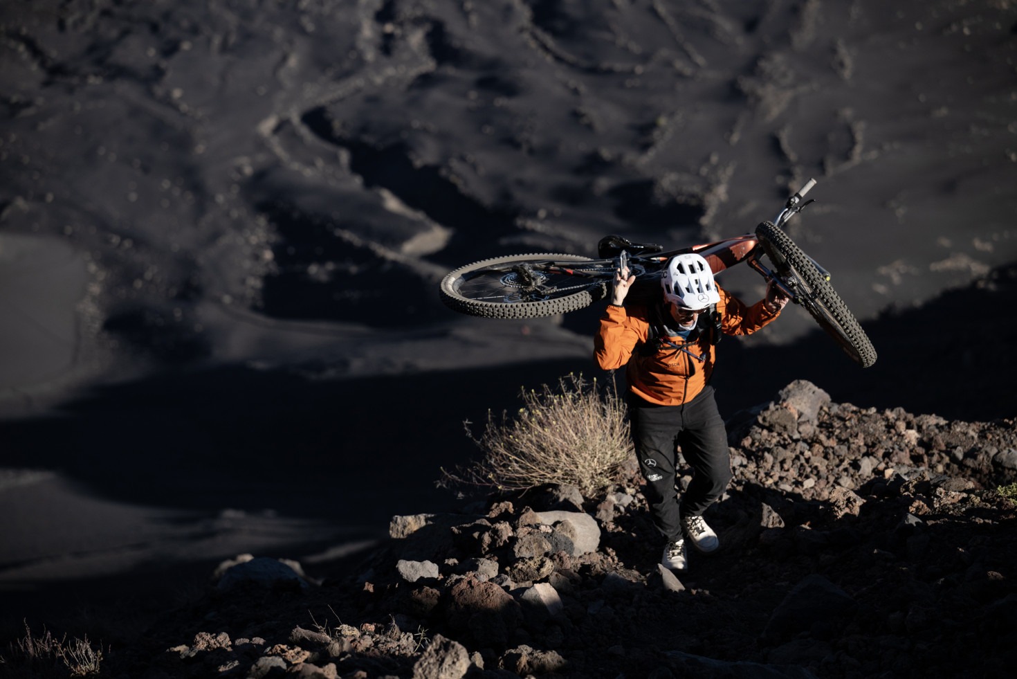 Bis rund 2.100 Meter gelingt es ihm, zumindest streckenweise zu fahren. Doch je näher der Krater rückt, desto häufiger kommt der Walk-Modus zum Einsatz, bis er schließlich das Bike schultern muss. Der Boden färbt sich rot und gelb, mineralisch, fremd – wie auf einem anderen Planeten. Die brennende Sonne zieht ihm die Feuchtigkeit aus den Lippen, die Sonnencreme ist längst verschwunden.