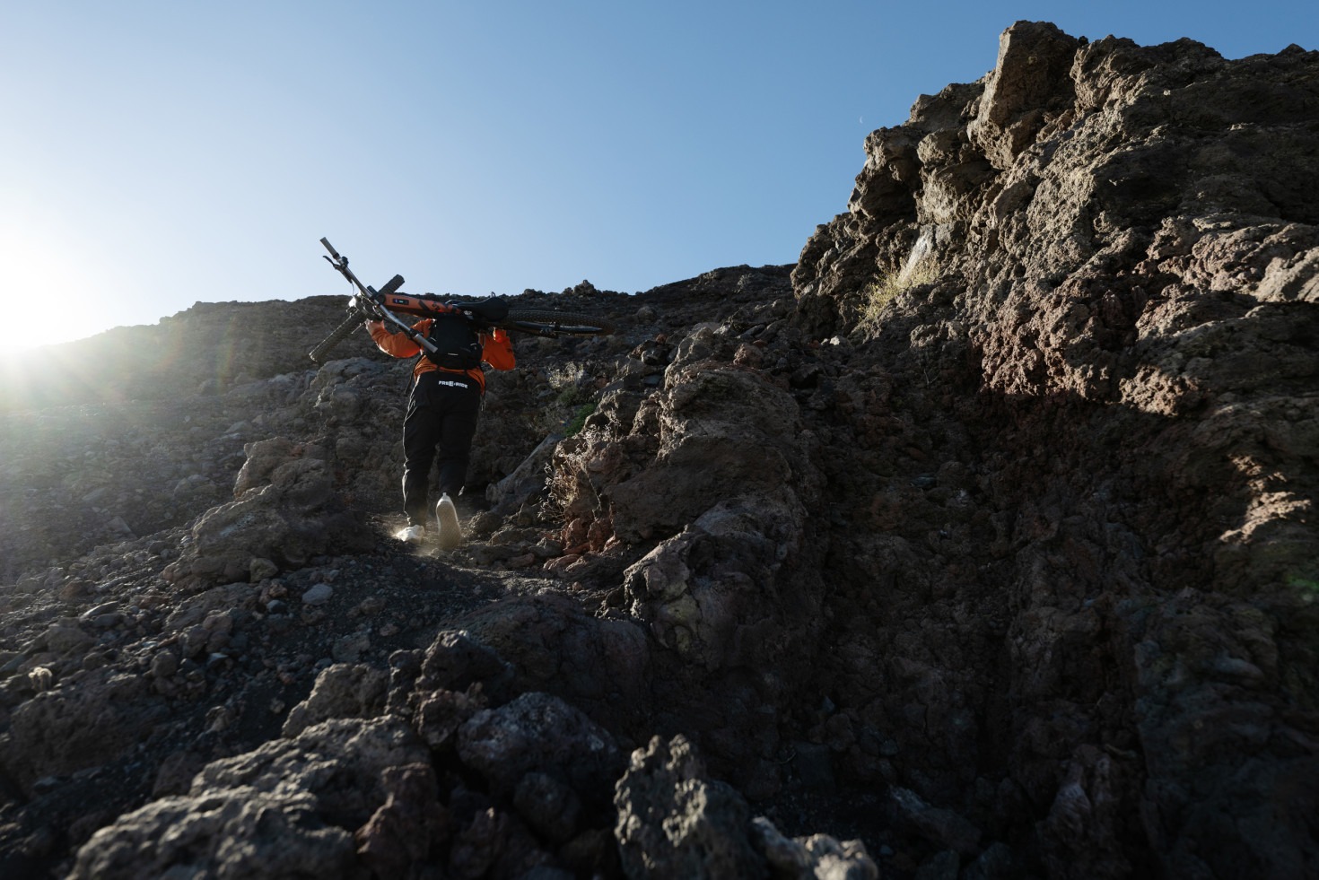 Am Strand startet der Versuch: knapp 3.000 Höhenmeter bis zum höchsten Punkt der Insel. Der Morgen ist kalt, doch nach Sonnenaufgang verwandelt sich die Luft in ein glühendes Band aus Hitze und Wind. Gasperotti kämpft sich zunächst durch Gestrüpp, später über lose Lavaflächen – ein Untergrund, der unter den Reifen knirscht, nachgibt und immer wieder zum Absteigen zwingt.