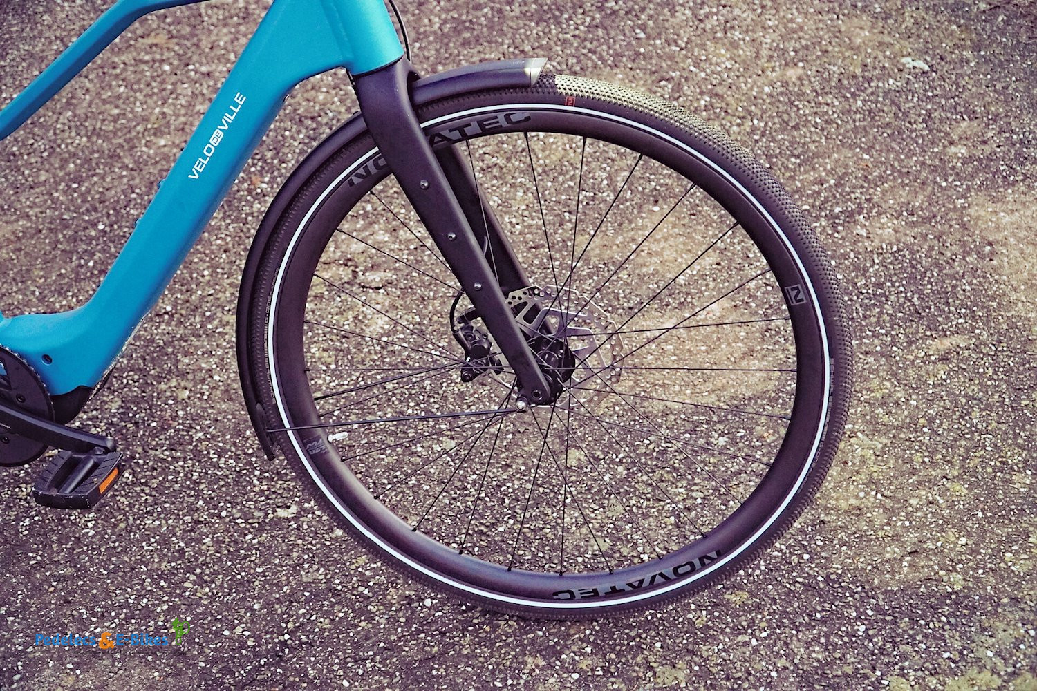 Die Kombination aus der Carbongabel und den 40 mm breiten Schwalbe G-One Allround Reifen auf den leichten Carbonfelgen sorgt für ein komfortables und zugleich agiles Fahrgefühl. Unebenheiten wurden erstaunlich souverän abgefedert, das Handling wirkt direkt und präzise. Hier hat VELO DE VILLE bei der Abstimmung ganze Arbeit geleistet.